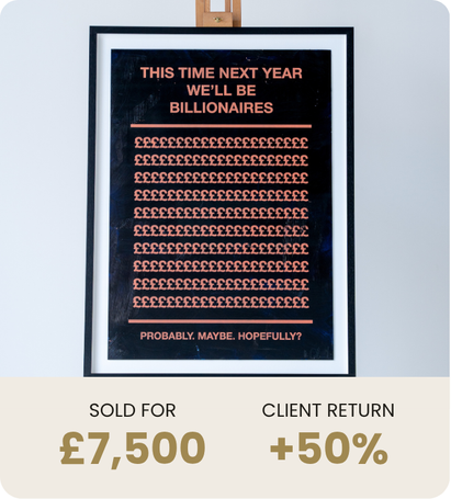 The piece by Mr. Controversial recently sold at auction for £14,000 delivering +40% return on investment for our client. The artwork, known for its bold statement and design had generated considerable interest among collectors, contributing to its strong performance at auction.